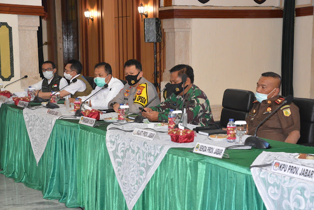 Bandung (LawuPost.Com) Pangdam III/Slw Mayjen TNI Nugroho Budi Wiryanto, S.I.P., M.M., Q.I.A, beserta pejabat Forkopimda Jabar dan pejabat lainnya mengikuti Rapat Koordinasi Khusus (Rakorsus) Tingkat Menteri yang di selenggarakan melalui video conference menggunakan aplikasi zoom meeting, bertempat di Ruang Siliwangi Kodam III/Slw, Jalan Aceh NO. 69, Bandung, Jabar, Rabu (9/9/2020).